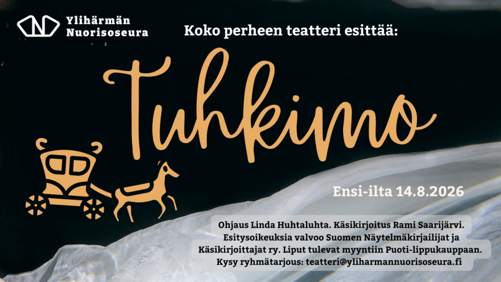 Ylihärmän nuorisoseuran Koko perheen teatteri esittää loppukesästä 2026 satunäytelmän Tuhkimo. Rakastetun prinsessasadun raikkaassa uudessa versiossa nähdään hulmuavia helmoja, tanssin pyörteitä, suuria tunteita ja onnellinen loppu.